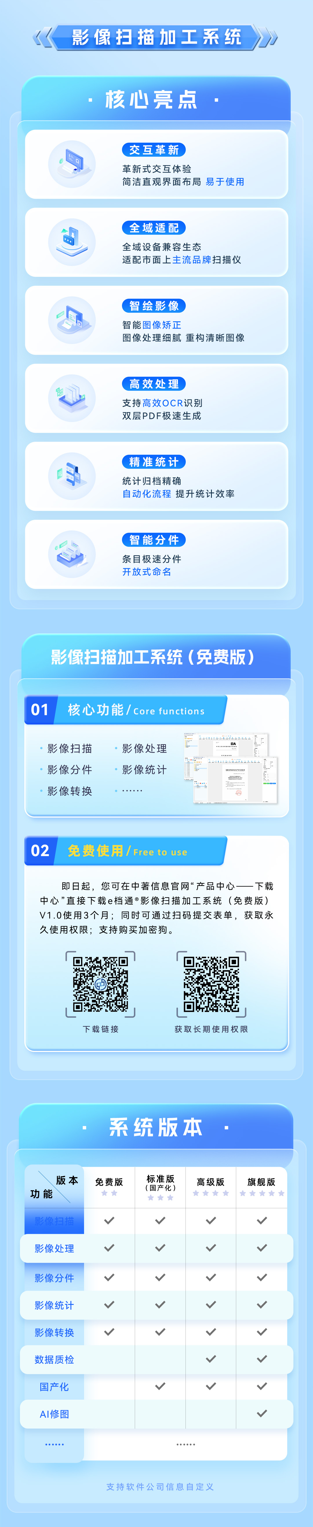 中著影像扫描加工管理系统,是一款自主研发集常规影像扫描、图像处理和管理为一体的适应机关企事业单位自行使用和档案服务公司外包使用的加工系统。经过多年项目实际使用打磨,操作简单方便,功能集成度高,有效提高工作效率。系统分为单机基础版、单机标准版、网络版(可定义档案类型)、人事档案行业版(干部人事档案、企退档案、流动人事档案等)。